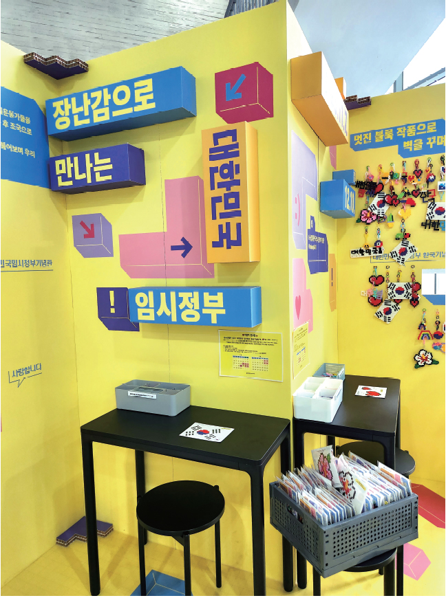 이번 행사에서는 한국 독립운동의 순간으로 대한민국 임시정부 샤페이로 청사와 안중근 의사의 하얼빈 의거 장면을 재현한 레고 작품이 전시되어 있다. 또한 관람객들이 직접 블록을 이용하여 대한민국 임시정부를 기억할 수 있는 장난감을 만들어 보는 체험 공간도 준비되었다. 관람객들은 블록으로 준비된 도안을 따라 태극기, 하트 모양을 만들어 볼 수도 있고, 본인이 창작한 블록 작품을 만들어 전시에 직접 참여해볼 수 있다.