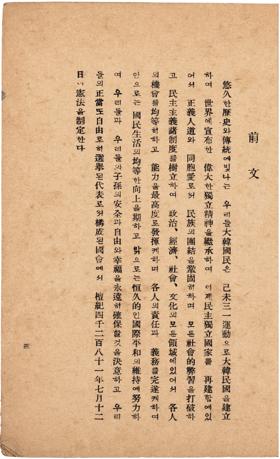 1948년 제헌헌법은 전문에서 “우리들 대한국민은 기미 3・1운동으로 대한민국을 건립하여 세계에 선포한 위대한 독립정신을 계승하여 이제 민주독립국가를 재건함에 있어서”라고 선언했고, 제1조 제1항에서는 1919년 4월 「대한민국 임시헌장」부터 이어온 “대한민국은 민주공화국”임을 표방했다. 또한 제헌헌법은 전문과 제1조 제1항뿐만 아니라 그 체계와 용어, 기본원리, 기본권 조항 등에서 임시헌법과의 연속성이 발견된다.