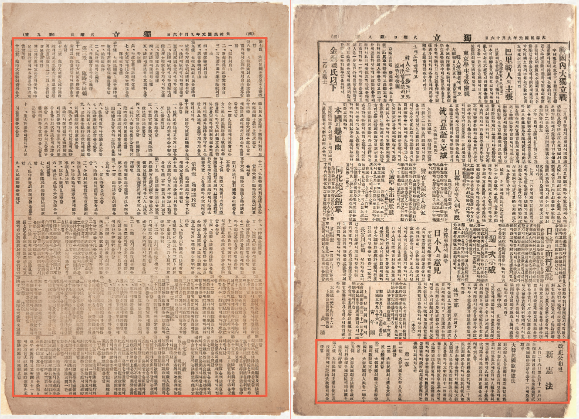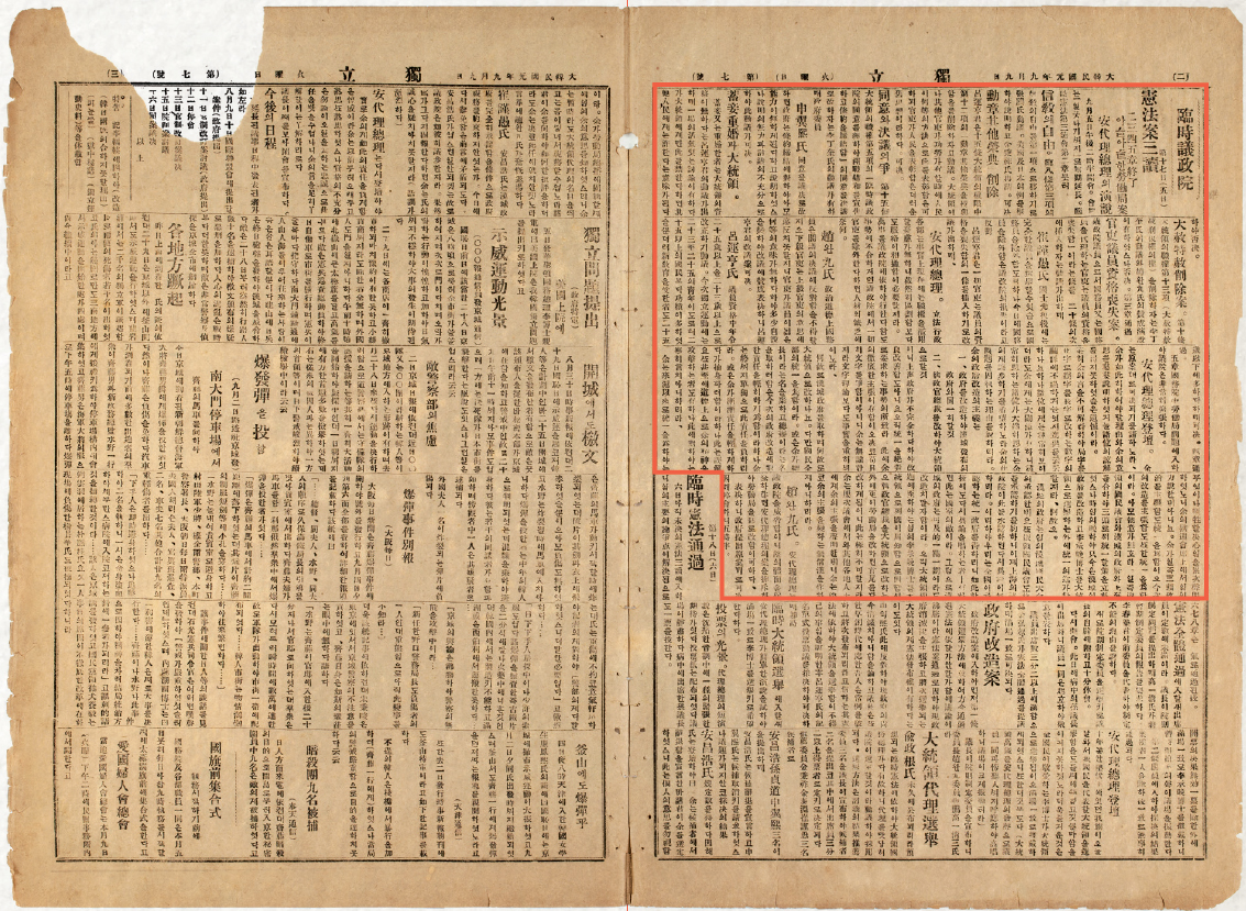 여기서 검토할 「헌법안삼독」(『독립신문』 제7호, 1919. 9. 9.)은 8월 28일 임시헌법개정안을 임시의정원에 제출한 뒤 9월 4일부터 개정안이 만장일치로 통과한 6일까지 진행한 제3독회의 내용이다. 「개정공포된 신헌법」(『독립신문』 제9호, 1919. 9. 16.)은 9월 11일 공포한 ‘대한민국 임시헌법’이다. 헌법개정 논의 과정은 같은 시기 『독립신문』의 임시의정원 관련 기사와 임시의정원에서 정리한 「임시의정원 기사록 제6회(1919. 8.)」를 참고할 수 있다.