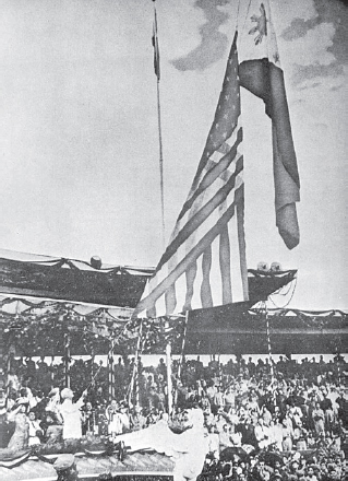 1946년 7월 4일 필리핀 독립 선포 과정에서 국기 게양 장면(내려가는 성조기와 올라가는 필리핀 국기)