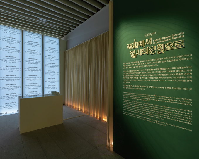 에필로그에서는 국회에서 임시의정원을 기념해 온 이야기를 살펴보며 전시를 마무리합니다. 임시의정원은 민주공화제를 지향하며 다른 나라의 간섭 없이 우리 스스로 개원한 최초의 의회로, 단순한 의회의 역할을 넘어 대한민국 임시정부와 함께 독립운동의 주축이었고 동시에 우리나라 의회 민주주의의 시작점이었습니다. 국회는 임시의정원의 정신을 기리기 위해 기념물 설치, 특별전시 개최, 자료 해제집 출간 등 다양한 사업을 펼쳤습니다.