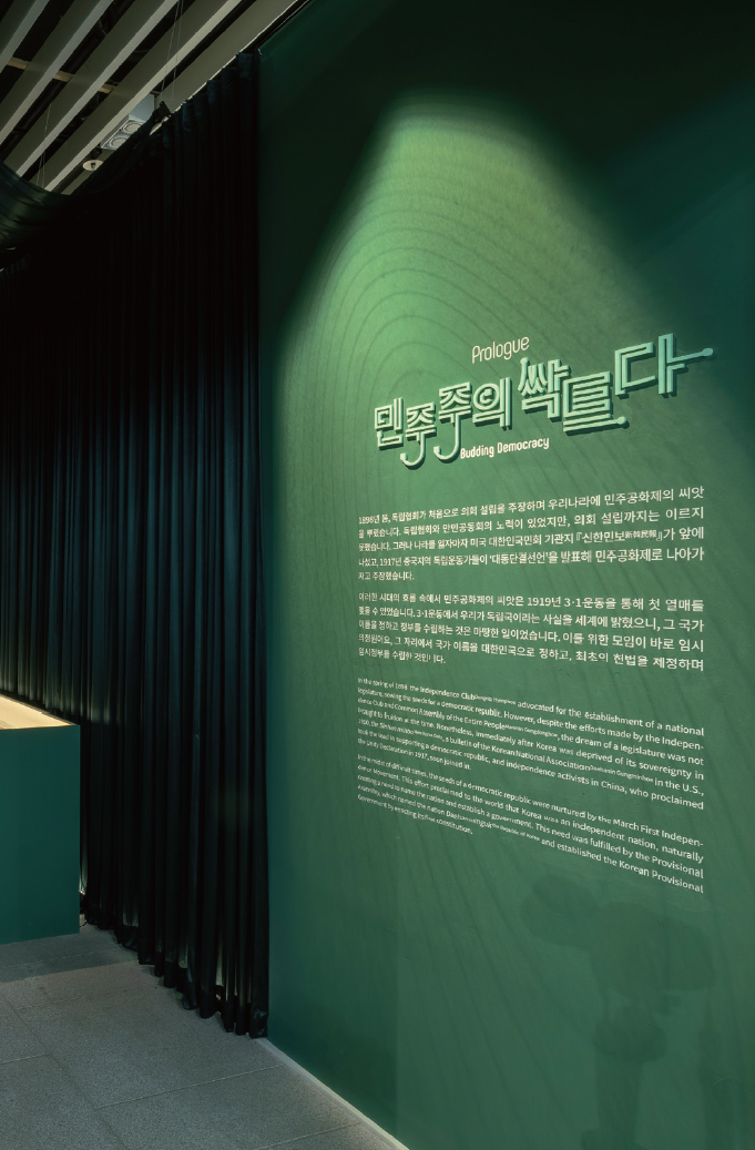 전시는 대한민국 임시정부와 임시의정원이 설립되기 전에 민주주의 시작을 볼 수 있는 공간으로 시작됩니다. 독립협회가 처음으로 의회 설립을 주장하며 우리나라에 민주공화제의 씨앗을 뿌렸습니다. 이 씨앗은 1919년 3·1운동을 통해 첫 열매를 맺을 수 있었습니다. 3·1운동은 우리가 독립국이라는 사실을 세계에 알렸고, 이후 대한민국 임시정부 수립과 국가 이름을 정하기 위해 임시의정원이 탄생했습니다.