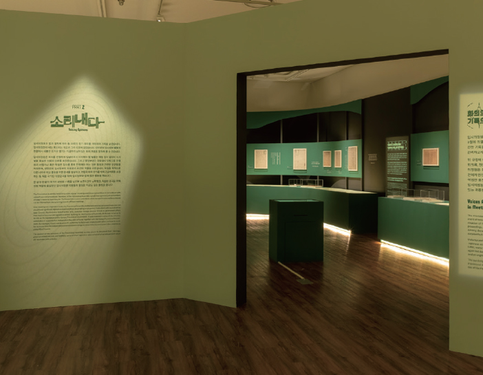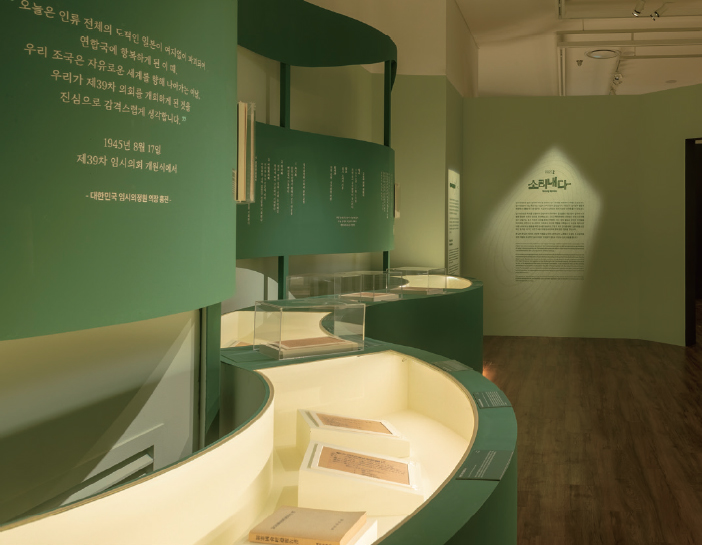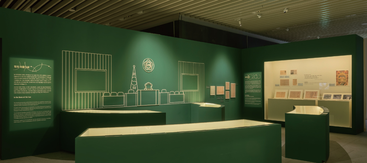 1부 〈이어지다〉는 임시의정원과 국회가 어떻게 이어졌는지를 직접적으로 보여주는 공간입니다. 국회는 임시의정원을 계승하며 발전해 왔습니다. 임시의정원은 1919년 개원할 때부터 광복한 뒤 ‘국회’로 이어간다는 원칙을 헌법에 밝혀두었습니다. 그리고 헌법을 제·개정하는 등 27년 동안 활약한 끝에 오늘의 국회로 계승되는 토대를 마련했습니다. 임시의정원과 국회 모두에서 활동한 인사들도 여럿 있으니, 임시의정원을 국회의 전신이라고 평가하는 것은 마땅합니다. 1부의 주요 유물로는 대한민국 임시정부의 첫 헌법인 〈대한민국 임시헌장〉, 신익희의 유묵 〈제헌제공공재민국制憲諸公功在民國〉이 있습니다. 신익희는 1919년 4월 대한민국 임시헌장과 임시의정원법 등의 법률 제정 기초위원이었으며, 이후 제헌국회에서 법률 제정과 입법 활동을 이어나가기도 했습니다.
