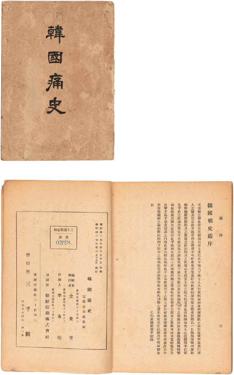 1915년 상하이에서 발간된 『한국통사韓國痛史』는 제목 그대로 “통한의 역사”다. 박은식은 조선 몰락의 원인을 냉정하게 진단하며 당쟁, 사대주의, 개혁 실패, 국제정세 오판 등을 기록했다. 하지만 『한국통사』의 목적은 단순히 과거의 실책을 비판하는 데 그치지 않았다. 그는 민족이 스스로 돌아보고 각성하기 위해 고통스러운 실패의 역사를 정면으로 드러냈다. 일본의 침략 과정과 조선 조정의 무기력을 낱낱이 묘사하며, “우리 스스로가 현실을 제대로 보지 못했기 때문”이라는 자성의 메시지를 반복해 강조했다. 그는 나라를 잃은 이유를 정확하게 아는 것이야말로 부활의 첫걸음이라고 보았다. 그는 ‘우리가 왜 망했는가’에 대해서 절절하게 반성하는 마음으로 냉정하게 현실을 직시했다. 뼈아픈 현실임에도 불구하고 그는 “국혼만 살아 있다면 국가는 반드시 재건할 수 있다”라는 확신으로 이 책을 집필했다. 그는 침략의 전개 과정, 국제 정세를 읽지 못한 조선의 판단 착오, 민중들이 겪은 고통 등을 상세히 기록함으로써, ‘민족정신의 상실이 국가의 몰락을 초래했다’라는 역사적 교훈을 제시했다. 『한국통사』는 망국 민족이 다시 일어서기 위한 부활을 준비하는 교과서라고 할 수 있다.