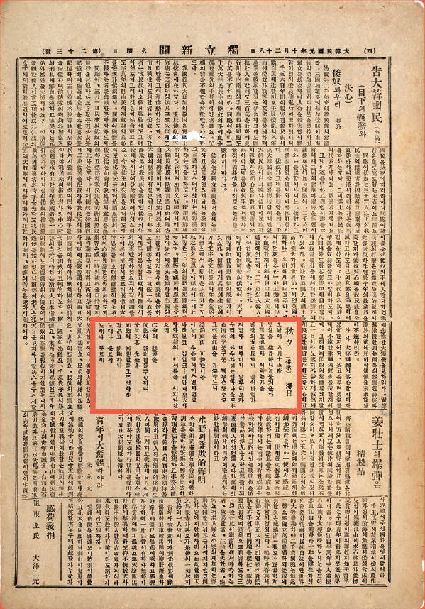 「추석」, 『독립신문』 제23호(1919. 10. 28.)