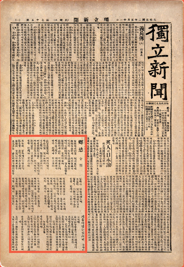 「향수」, 『독립신문』 제75호(1920. 5. 11.)